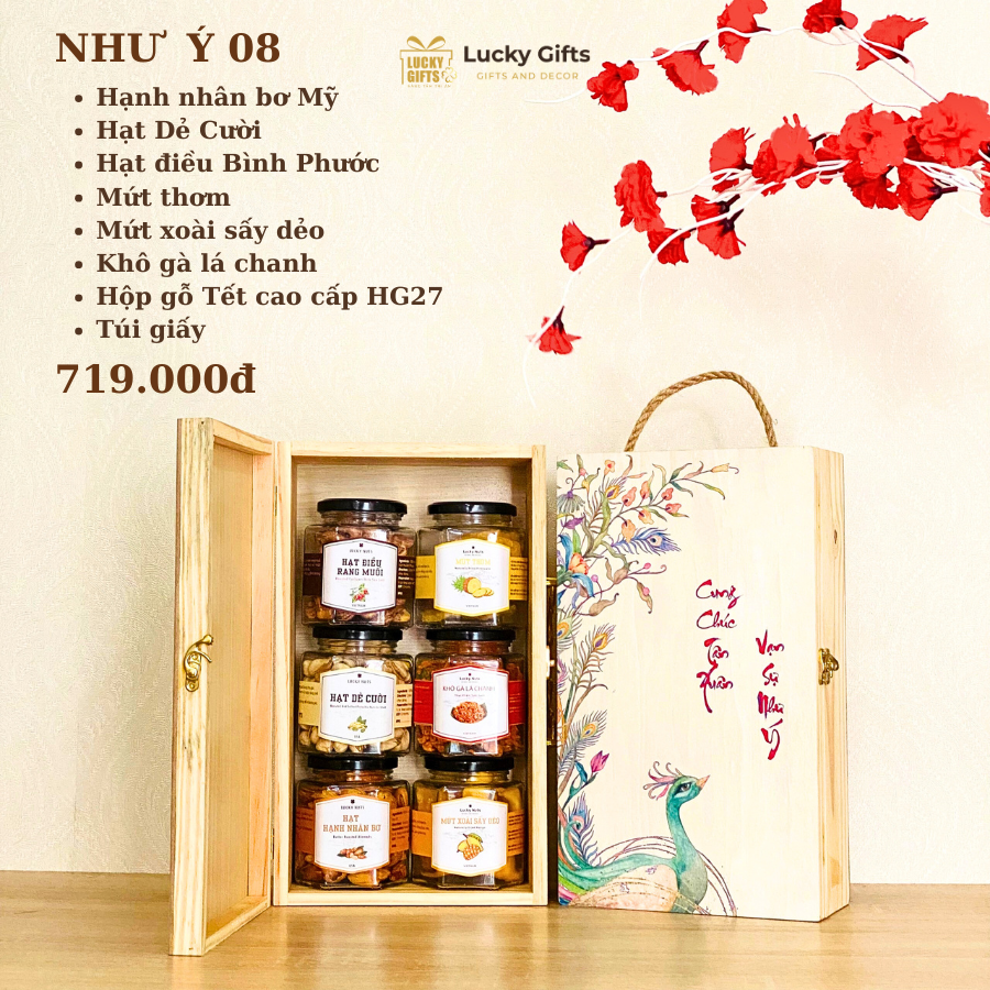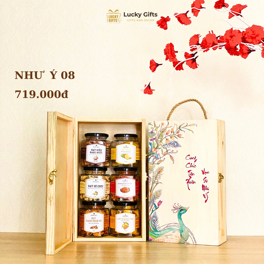Hộp quà Tết Như Ý 08 – Hộp gỗ cao cấp, 6 món quà dinh dưỡng | LuckyGifts
